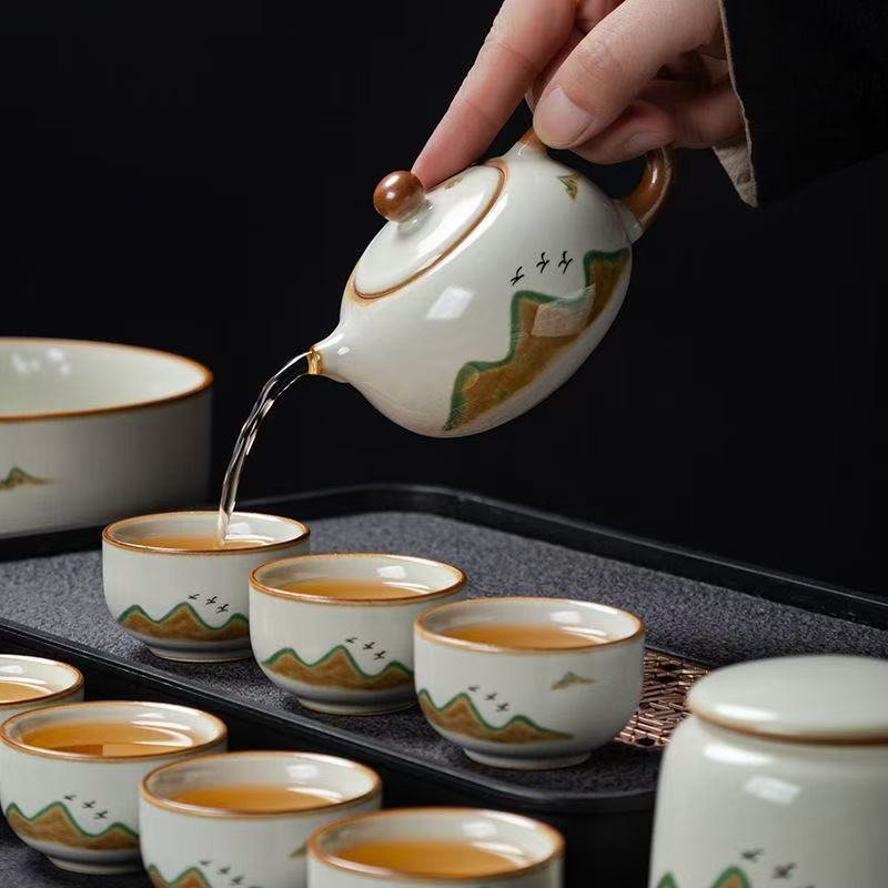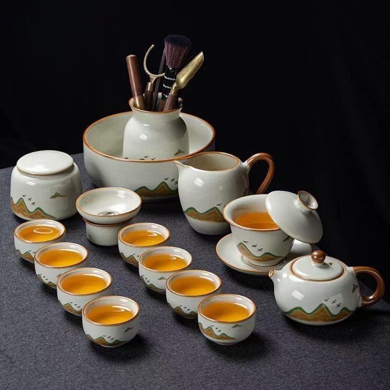 Kungfu tea set Ru kiln set Chinese style light luxury high-end ceramic home living room teapot teacup complete set complete set of covered bowls