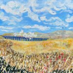 A train steams across the viaduct, its plumes of smoke dispersing into a sky filled with layered, textured clouds. Below, the yellow grasses of the Dales are built up through layered brushstrokes, splashes, and painterly texture, creating depth and energy in the landscape. The loose, expressive style captures the wildness of the setting and the movement of the moment.
